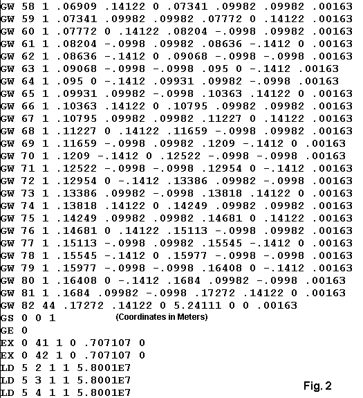 Part of the extended exercise in looking at NEC loads, both mathematical and physical, has involved sorting out the losses attributable to the load from those which may be associated with the linear wire portion of the antenna. For this purpose, we shall need to make the linear wire lossless and the coil wire of a suitable material, namely, copper. At present, only GNEC (Nittany-Scientific) permits a wire-by-wire material selection. Fig. 2 shows a partial .NEC file from GNEC, with the dimensions in meters.