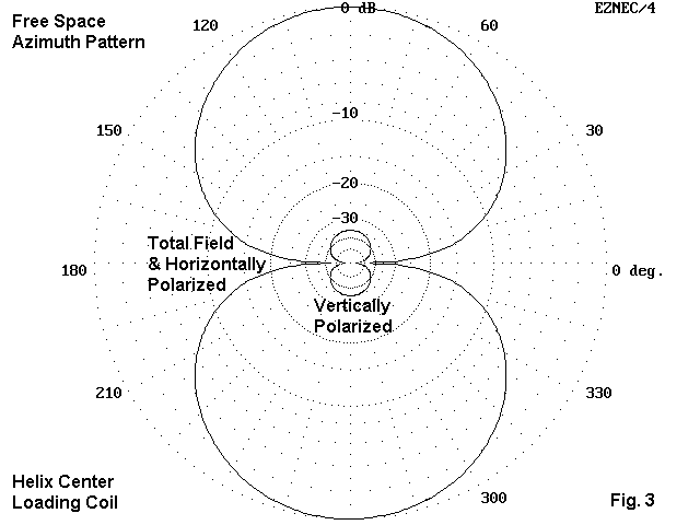 The small but definite vertically polarized radiation field results from radiation from the portions of the helix that are vertically oriented. This field alone would not suffice to provide the added gain over the Q=300 center loaded model, but the entire 13.6" length of the inductor would. More precisely, that portion of the overall inductor wire beyond the 13.6" it replaces in the overall antenna length would suffice to provide additional gain.