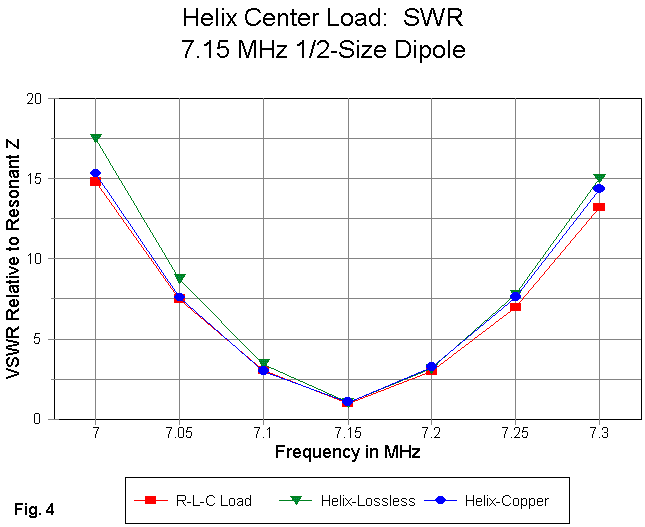 Despite the lower Q estimate, the source impedance of the physically modeled helical loaded dipole is lower than even the Type 0 model at zero load loss. As Fig. 4 shows, the SWR curve is slightly steeper than even the R-L-C lossless load model--and a lossless helix yields a steeper curve yet.