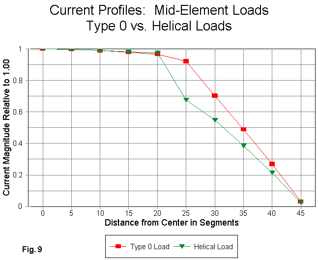 Like the physically modeled center load, the physically modeled mid-element load shows a much larger drop in current at its outer end than does a corresponding Type 0 load. The dramatic decrease in current immediately outside the loading helix appears vividly in Fig. 9, with the Type 0 load curve shown for comparison.