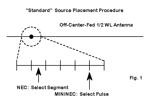 If your program allows, you can approximate the 300-Ohm feedpoint by moving the source off center, as shown in Figure 1. In MININEC, we select a pulse number, which is always at the junction of two segments. In NEC, we select a segment and visualize the source as being at its center. Of course, we use sufficient segments in each case to ensure convergence.