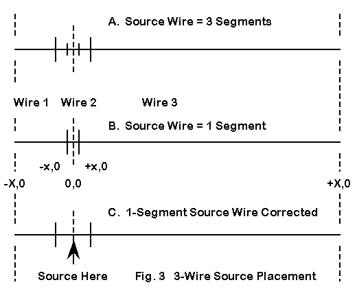 The 3-wire method of source placement is the most accurate and unambiguous for NEC. Moreover, using 3 segments in the source wire resists the effects of unequal segment lengths in adjacent wires more effectively than using only one segment in Wire 2, although the effects even on the 3-segment center wire can upset precision in some instances. As we noted in the beginning, these methods are applicable only where source placement needs to be as precise as possible.