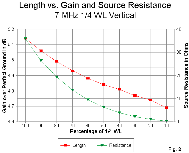 The graph in Figure 2 shows what happens for our 7 MHz vertical--and for any other 1/4 wl vertical, as well as for any free space dipole. The gain begins to drop from its peak of 5.14 dBi down to 4.69 dBi at the 10% of original length mark (3.4'). Equally notable is the drop in feedpoint impedance from nearly 36 Ohms down to a fraction of an Ohm. As the resistance at the source drops, the capacitive reactance rises from zero for the full length antenna to over 1400 Ohms for the antenna that is only 10% of that length.
