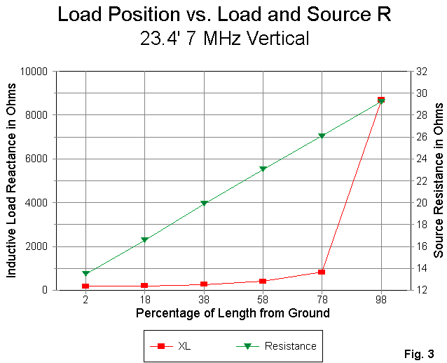The graph in Figure 3 shows part of the results of our work. The source resistance climbs steadily from its low of 13.49 Ohms up to 29.21 Ohms with the load very near the tip of the antenna element. However, note the curve for the required value of inductive reactance. Near the element tip. the required reactance is 8680 Ohms, or a seeming inductance of 0.197 milliHenrys. The real antenna would be resonant just from added wire length in the solenoid long before that high an inductance was reached.