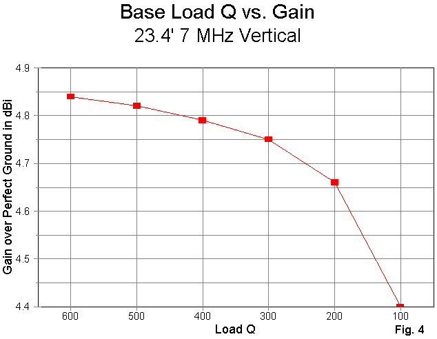 Again, it would be useful to know the effect of Q on loads for every antenna length possible and at every load position along each of the antennas. However, for this example, let's stick with our 23.4' long vertical (corresponding to a 46.8' dipole) and explore the effects of Q upon just the base load and the mid-element load models.