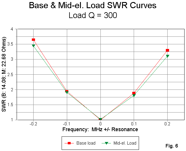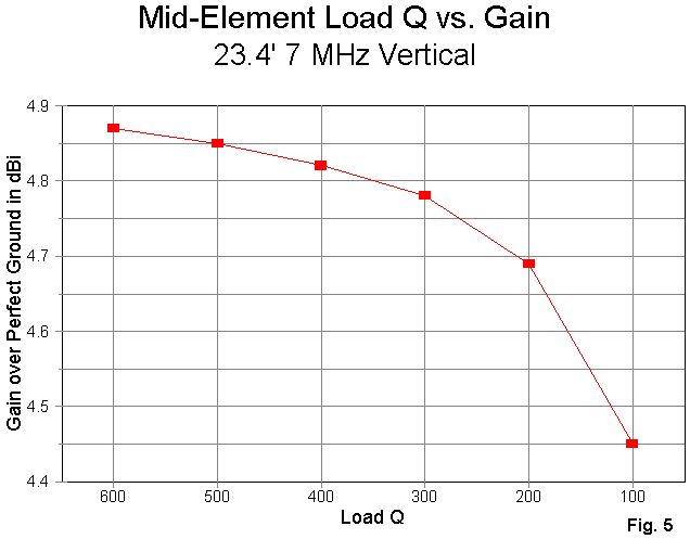 Throughout the range of Q values for both the base loading and the mid- element loading models, the difference in gain between the models is never greater than about 0.3 dB. This very slight difference belies some common recommendations often heard that give mid-element loading grandiosely higher marks than base loading. We have a case here of remarks being taken out of their original context and becoming unwarrantedly general. Nothing in the physics of a loaded antenna warrants them.