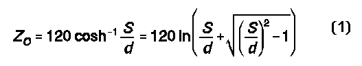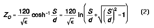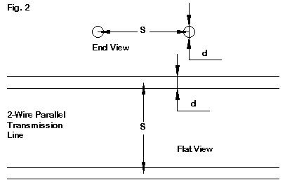 where Zo is the characteristic impedance of the line, S is the center-to-center spacing of the wires, and d is the diameter of the wire. Fig. 2 illustrates the elements of the calculation. If the two wires have different diameters, some references replace the element d with the square root of the product of the two individual diameters.