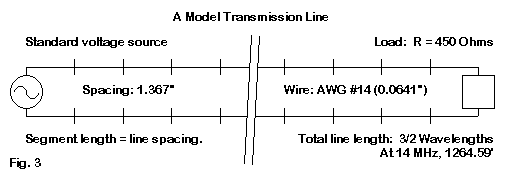 We must pay reasonably careful attention to the model that we use for correlating NEC to standard calculations. First, as suggested by Fig. 3, the segment lengths should all be about 1.367" to correspond with the short source and load wires at the end of the transmission line. Second, the end wires do change the overall effective line length by a small amount. Therefore, the length selected for the check is 3/2 wavelengths, which minimizes the amount of error per half wavelength. For a test frequency of 14 MHz, the resulting model has 1852 segments.