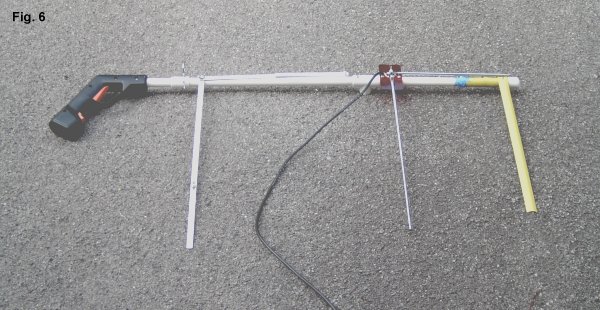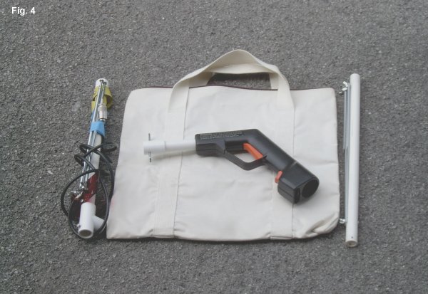 Most fox-hunting antennas that I have seen use rubber hand-grips in line with the antenna. These grips are most suitable to point Yagis at satellites, but are not ergonomically suitable for aiming the antenna straight ahead. Therefore, I took the pistol grip handle from a defunct electric weed cutter and replaced the steel tube with a short length of PVC. Since the in-line coupler bears the lever-force of the entire antenna ahead of it, I cemented the coupler to the handle-end pipe. Fig. 4 reveals that I left the trigger in place, since it is smooth, while the bare opening without it has sharper, less comfortable edges. You can store the entire antenna as a 3' long storage unit that is only about 4" wide, plus the handle. Alternatively, you can remove the handle and break the boom at the Tee for even more compact storage. Fig. 4 shows the pieces in full storage mode.