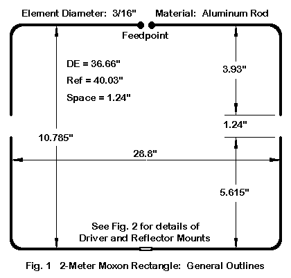 For those who might like to try fox hunting as a family adventure, here is a run down on one way to build a good Moxon rectangle. Fig. 1 shows the basic outline of a Moxon rectangle for 146 MHz using 3/16" aluminum rod elements. The most critical dimension is the gap between the driver and the reflector. It is desirable to set the element pieces to the correct length as the first act in building.