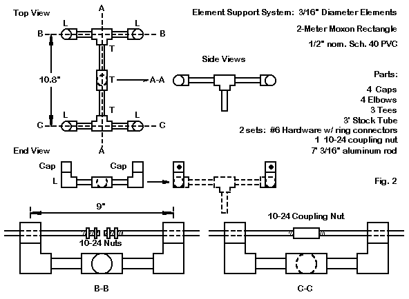 The antenna and support details appear in Fig. 2. Looking at details B-B and C-C, we can see the plan of assembly and feeding. The antenna will consist of 4 rods, each threaded to 10-24 on one end. The driver will have pairs of 10-24 stainless or aluminum nuts to hold terminal rings from the feedline. The reflector half-elements will join in a stainless steel coupling nut (a short piece threaded all the way through). You can purchase these or make one from a small piece of 1/2" by 1/2" aluminum stock. Simply drill though the piece from end to end and tap the required 10-24 threading.
