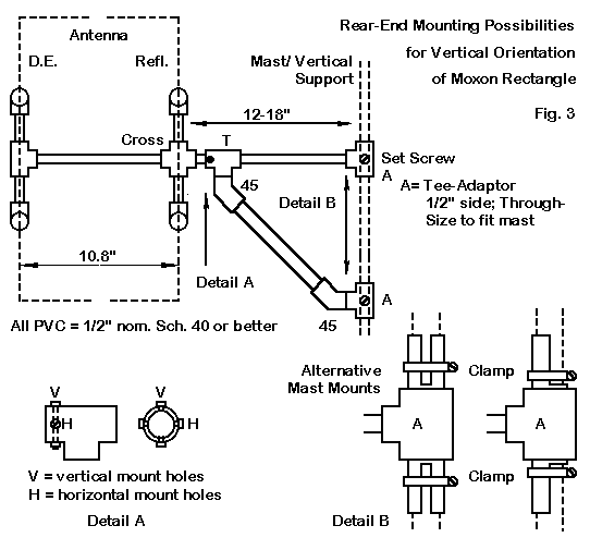 Fig. 2 also shows a center Tee fitting for connection to a mast. This fitting is optional and would be suited more to the horizontal use of the antenna. Lets look at the alternative that I actually used in Fig. 3. When vertically orienting the Moxon, a rear support system is very useful. We can make one up out of more PVC fittings and pipe. For my test antenna, I used a single PVC pipe section between elements, with the reflector center point holding a 4-way cross fitting. Another pipe stub proceeds rearward and friction fits into the Tee in the support. I drilled two sets of holes through the stub so that I could change the antenna's orientation from vertical to horizontal and back by removing only a single bolt.