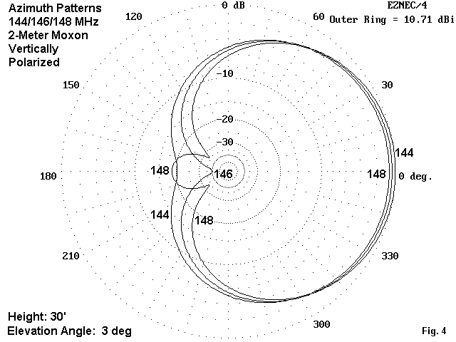 The basic azimuth pattern of a Moxon shows, at its design frequency, a deep null, with some forward gain. For most VHF uses, it is the pattern shape, with its very high front-to-rear ratio, that holds more interest than the antenna's gain. Fig. 4 reveals the azimuth pattern of a 2-meter Moxon when the antenna is vertically oriented and, hence, vertically polarized. The model is designed for 146 MHz and the deepest null occurs only in the vicinity of the design frequency. Hence, you may wish to scale the antenna for the precise frequency on which fox hunts are conducted in your area.