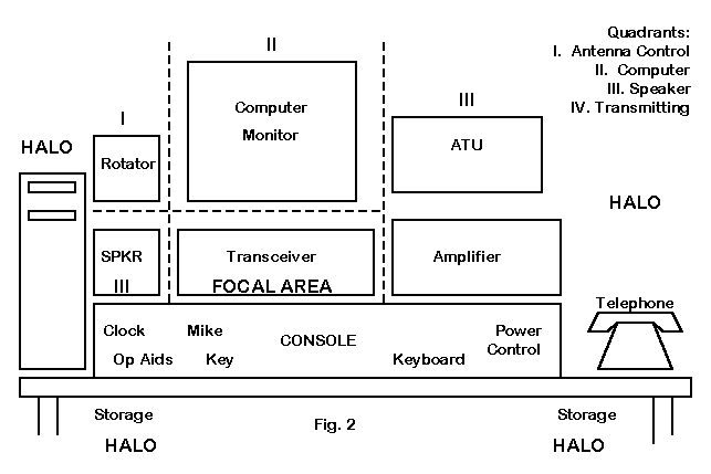 3. The Horizontal Perspective. Horizontally, equipment should ideally be laid out according to principles of focus, quadrant, and halo. Fig. 2 illustrates the three concepts with a typical modest HF station. VHF, SSTV, RTTY, packet and other specialized operations will have their own layouts, but three focus-quadrant-halo principles will still apply. Of course, most of us can only approximate the ideal.