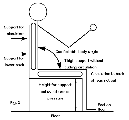1. Seating. A good chair is a must for any operating position. A good chair must support the base of the shoulders and the lower back. The length of the seat pad should support the legs, but not cut off circulation to the calves. The seat should be just high enough to support the thighs while leaving the feet on the floor, again, so as not to cut off blood in the back of the thighs. Fig. 3 illustrates these points.