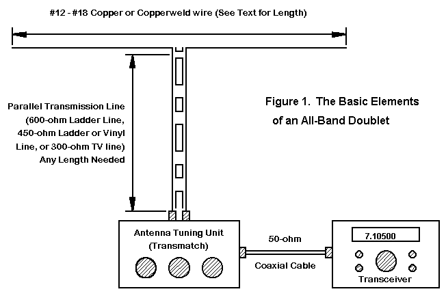 As shown in Figure 1, the basic all-band doublet antenna system consists of 3 parts: the antenna proper, the feedline, and the antenna tuning unit (or transmatch).