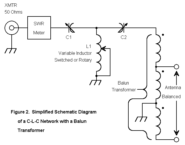 Most antenna tuners use unbalanced networks. The most popular network used in commercial tuners is the series C, parallel L Tee network, schematically shown in Figure 2. The popularity of this network stems largely from the fact that it is the most economical to produce and from the relative ease of tuning it to an adequate low-SWR match.