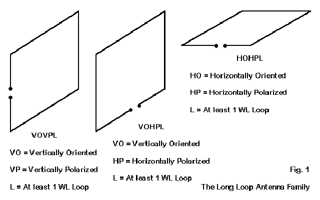 Fig. 1 shows the three families of antennas. VOVPLs are vertically oriented, vertically polarized wire loops, such as the delta and the rectangle when we feed them along the side. They stand upright and vertically polarized radiation is broadside to the antenna plane. Ordinarily, VOVPLs are monoband antennas and perform less well than their relatives when pressed into service on other bands.