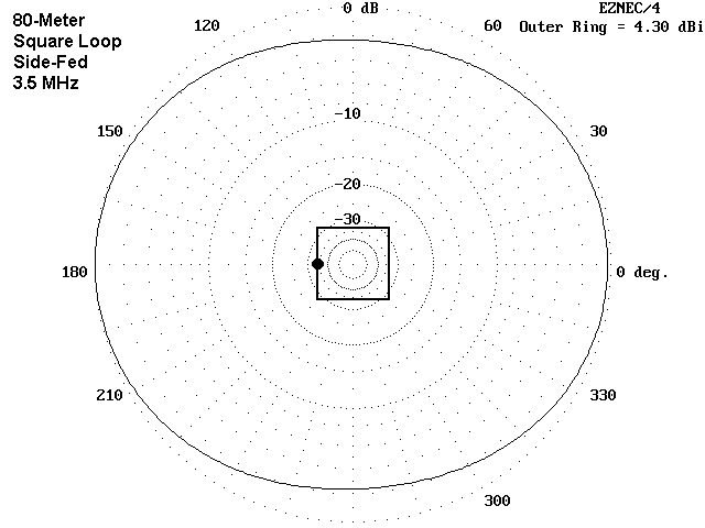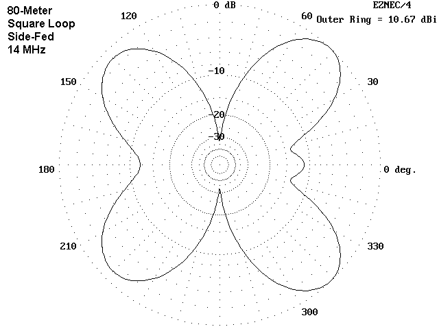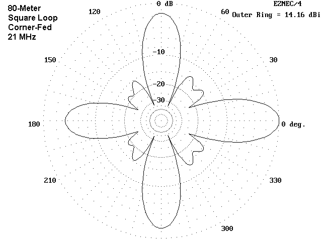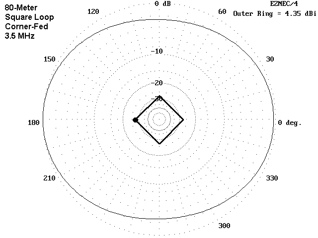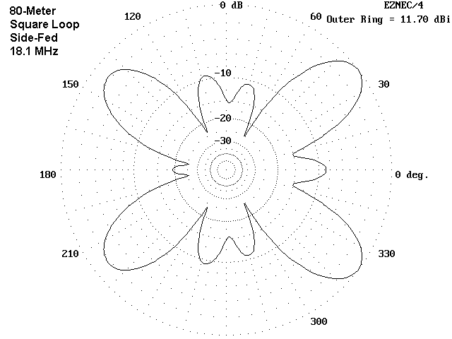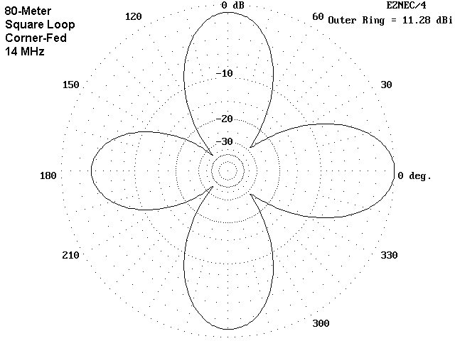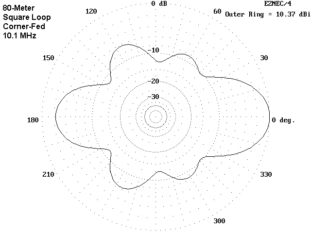 The square loops show a very distinct difference in shape and gain that depends upon the feed point. The side-fed model shows stronger lobes (by almost 0.8 dB) and deeper nulls. In contrast, the corner-fed model is a round-cornered diamond, with a bit less gain in the direction of the feedpoint. Moreover, the points of maximum gain for the corner-fed model are to the sides, that is at right angles to the axis passing through the antenna feedpoint and the point opposite it on the antenna loop.