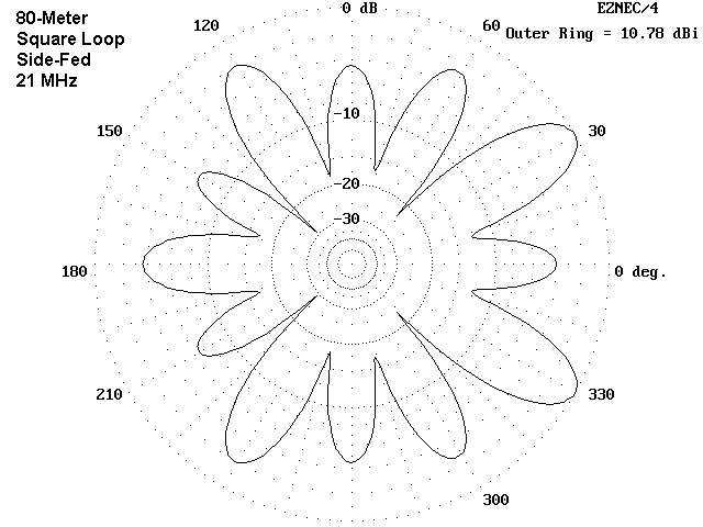The square loop shows major lobes near or above 10 dBi off each of the four corners. The lobes of the side-fed model are broader, which would lessen the problem of orienting the antenna toward desired areas of the world. In contrast, the narrower but stronger lobes of the corner-fed square would provide a gain advantage, especially in three of the four directions that the antenna favors. The cost of the added gain is a collection of very wide and deep nulls in the pattern, which would effectively limit communications in many directions.