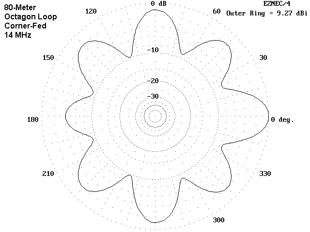 The corner-fed octagon pattern shows its affinity to the corner-fed square with a noticeable but less extreme bi-directional pattern. The greater "side" gain results in a lower gain along the major axis of the antenna, compared to the square. However, the "side" gain is not sufficient to qualify this arrangement as having good omni-directional potential.