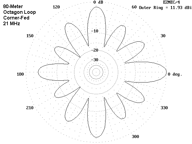 The 14 lobes of the 12-meter octagons are clear and distinct in both the corner and side fed versions of the antenna. In the octagons, the lobes are functions of the feedpoint in terms of direction. However, the difference between the two feed positions shows up in the minor differences in the relative strengths of the individual lobes, except for the one directly opposite the feedpoint.