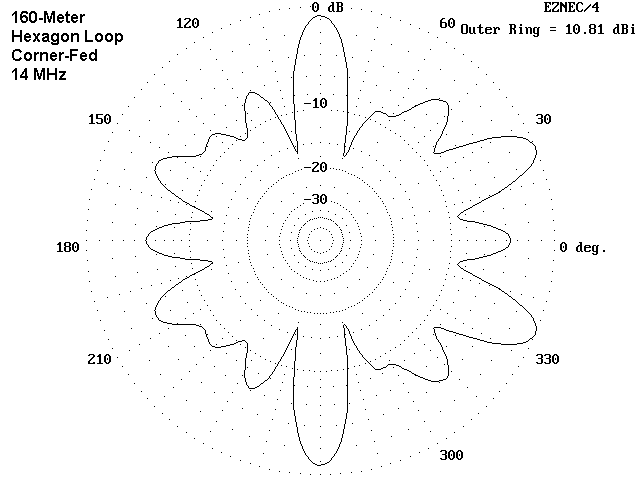 On 40 meters, the 160-meter loop becomes quite bi-directional with either corner or side feeding. Maximum gain occurs off opposite points of the hexagon. with corner feeding, the axis of maximum gain is through the feedpoint to the opposite corner. However, if we side-feed the hexagon, the axis of maximum gain is at right angles to the feedpoint-to-opposite side axis.