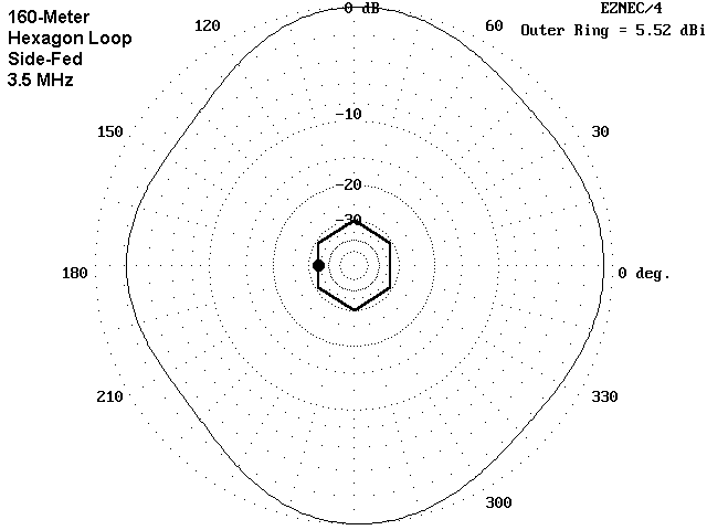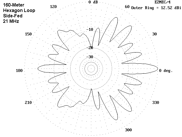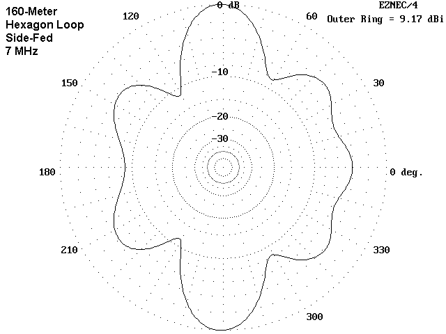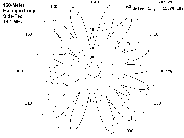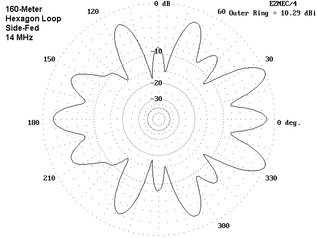 The patterns for the 160-meter hexagon at 10.1 MHz are roughly bi-directional along the axis from the feedpoint to the opposite position on the loop. However, the side-fed version achieves an almost rectangular pattern, which is somewhat of an oddity.