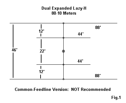 For someone with the tall pines or firs to get the longer array up high enough, a dual expanded Lazy-H may prove useful. The triangle array of arrays can also be used effectively with these antennas in order to cover as much of the horizon as possible with the least investment of antenna materials. Perhaps the only complexity will be to the suggested switching scheme that we explored 2 episodes back in connection with a simple 44' or 88' doublet.