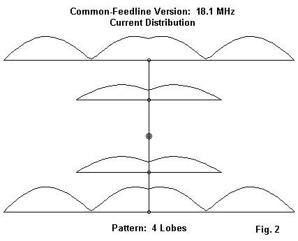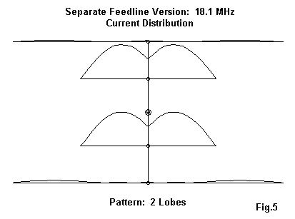 You may also wish to compare the performance figures with those for the independent 44' array we discussed in the last episode. The slight differences in numbers will reveal that we have not eliminated all interactions, but we have reduced them to a very low level. As an example, I fed the short array on 18.1 Mhz, just as I did for the combined feed system. However, this time, as Fig. 5 reveals, the long wires did not directly receive energy from the feed system. The vary shallow current level lines on the longer wires reveals how very low the level of interaction is on 17 meters--barely detectable. In contrast, the shorter carry virtually all of the current that yields radiation. A similar picture emerges on all of the upper bands. Hence, we can expect the array to provide broadside patterns on all bands if we feed the two arrays with separate pairs of phase lines.