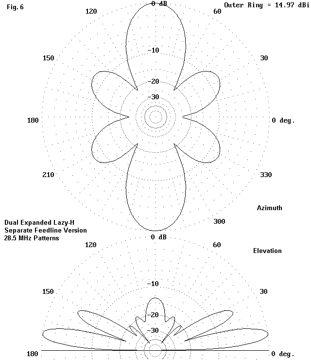 If we examine the azimuth and elevation patterns for 10 meters, we can confirm what the current distribution graphic has told us. In Fig. 6, we see the typical 10-meter EDZ pattern. The main lobes are both stronger and wider than those for the simple-feed version of the array. The elevation pattern is virtually indistinguishable from the one for a single 10-40-meter Lazy-H. The high lobes of Fig. 3 are totally missing. Instead, we have two low angle lobes, and the weaker, higher one may prove useful for sporadic E skip. In short, we have a successful array.