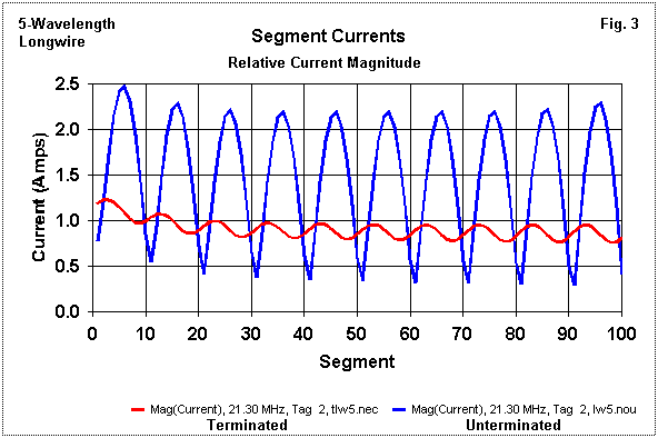 We can make a rudimentary comparison between a standing-wave and a traveling-wave antenna by examining the current magnitude swings down the long horizontal wire. In the case of the 5 wavelength version, we obtain the current patterns in Fig. 3. The left end of the graph represents the part of the long wire that is closest to the feedpoint.