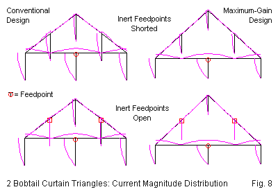 For each design type, the two current charts clearly show the difference between shorting and opening the unused feedpoints. With open feedpoints, the side center verticals are relatively inert. Hence, with open unused feedpoints, only the apex vertical contributes to the overall pattern formation. The exact magnitude and phase angle of the current on that vertical element is enough to tilt the pattern in one or the other direction. Remember that the apex vertical is closer to the active bobtail in the conventional design than it is in the maximum gain design. When the mid-side verticals are active, that is, when we short the unused feedpoints, we obtain somewhat different results in the two designs. In the conventional design, the active mid-side verticals contribute to a wide beamwidth in the apex direction, relative to the lobe in the opposite direction. In the maximum-gain design, the active mid-side verticals increase the radiation off the ends of the active bobtail plane.