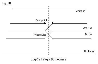 Let's add one final complexity. Fig. 12 showed one sample of a phagi, a Yagi using a pair of phased driver elements. Now we can pose a further fair question: When do we have a phagi and when do we have a log-cell Yagi? The most general answer will die a death of a thousand qualifications. Usually, a true log-cell Yagi will design the driver section using LPDA design procedures. In contrast, most simple phased driver sections tend to find their dimensions experimentally, that is, by trial and error. As well, the phagi driver section might use a common feedpoint with transmission line section going both forward and rearward (with the half-twist only on the rearward section). A true log-cell always places the feedpoint at the forward element in the cell.