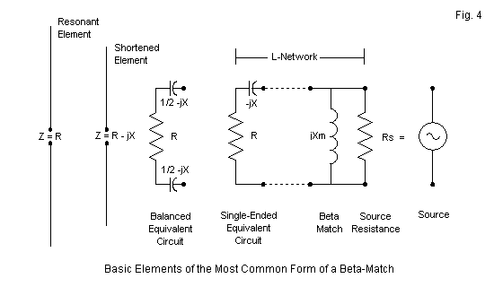 On a separate spreadsheet page, you will find calculations for the beta or hairpin match. Essentially, the beta match is a form of L-network specifically arranged to transform a higher line Zo to a lower antenna impedance. In the process, the network uses a shortened element that has capacitively reactance in the feedpoint impedance as one of the reactive components in the L-network. Fig. 4 shows the general evolution of the beta or hairpin match.