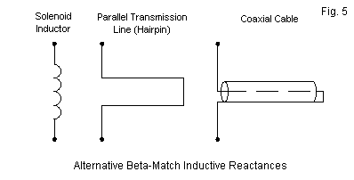 A solenoid inductor is feasible and generally has little loss, since its reactance will normally be quite low. However, shorted transmission-line stubs may generally provide the same inductive reactance with even lower loss. The hairpin or shorted parallel transmission line section is the version that most worries new users. However, the beta match in any form is as effective as virtually any other system in effecting a low-loss match between the element and the feedline--when the element resistive component is less than the feedline Zo. In addition, one may also lengthen an element to make it inductively reactive. Then the shunt component becomes a capacitance. Both versions of the beta match have undergone extensive modeling confirmation.