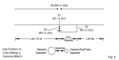 The gamma system begins with a larger number of variables, some of which are the physical dimensions of the assembly components. We need to know or decide upon the main element diameter, the gamma rod diameter, and the center-to-center spacing between these two parts. Calculations usually proceed (although there have been variations) by treating the gamma assembly as a section of parallel transmission line, shorted at the far end. The end result is a change in the position of the antenna feedpoint relative to the element without the gamma assembly. Most calculation systems do not take into account the far-end shorting bar structure or the structure that supports the feedline connector.