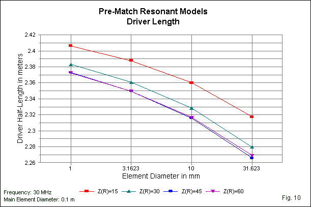 In all cases, I held the reflector at a length of exactly 0.5 wavelength. The spacing varied as needed to yield a resonant driver. Fig. 10 shows the driver half-lengths required for each impedance level as the element diameter increased. Note that there is virtually no difference between the 45-Ohm and the 60-Ohm driver lengths for any given element diameter; the spacing alone is sufficient to create the impedance difference. In the development of these models, the actual performance of the resulting beam is not in question and was not recorded. For gamma-match considerations, only the feedpoint impedance is significant.