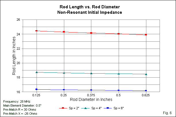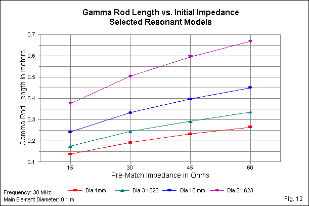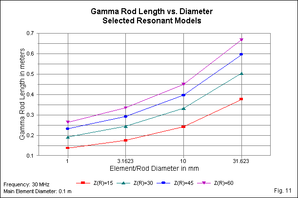Fig. 11 examines the required gamma rod lengths for each impedance level as we increase the element diameter. The curves show two results. First, the use of logarithmic increments results in relatively tame curves without requiring an unnecessarily large number of steps (and models). Second, the curves, while appearing to be congruent, do not achieve sufficient coincidence to allow effective regression analysis into a single set of design equations.