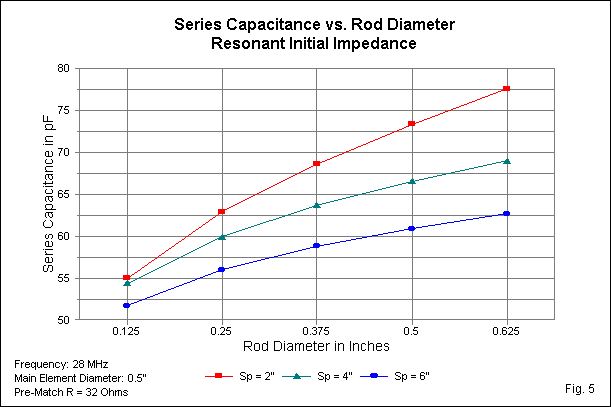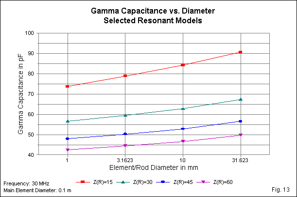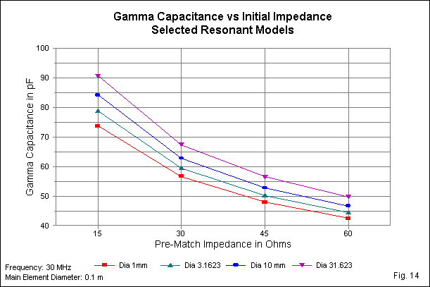 Fig. 13 graphs the series capacitance data with separate curves for each initial impedance level. All curves show a rising series capacitance as we increase the element diameter. The lowest initial feedpoint impedance requires the highest series capacitance values. Once more, the curves are nearly but not quite congruent.