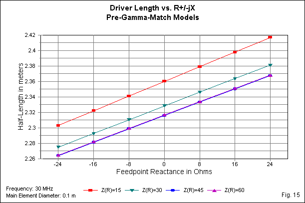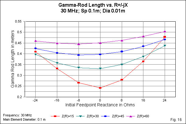 The graph uses enough increments and enough initial impedance levels to be instructive, at least so far as we may interpret the MININEC models. First, the higher the initial impedance level, the shallower will be the curve of required gamma-rod lengths from -j24 to +j24 Ohms reactance. The ratio of maximum gamma length to minimum gamma length is about 4 times greater for the 15-Ohm curve than for the 60-Ohm curve. It is likely no accident that the ratio of initial impedance levels is also 4:1. It is probable that the curves would better approach congruence had we set up the exercise by reference to the impedance phase angle rather than using definite values of reactance.