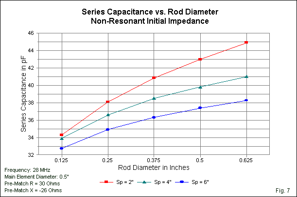 The shapes of the curves for the required series capacitance in Fig. 7 are virtually identical to those for the resonant model in Fig. 5. For all three spacing values, the resonant model required series capacitance values about 1.6 times higher than the ones for the non-resonant model using the thinnest gamma rod. The ratios only grow to between 1.7 and 1.8 using the fattest gamma rod. Within broad but usable limits, then, we may rely upon the trends of other modeling directions to be indicative of all spacing values and all element-to-rod ratios, even if we restrict ourselves to a single element-to-rod ratio and a single spacing value.