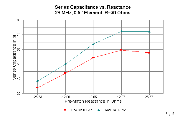 As we would expect from the previous trends in modeled gamma match assemblies, the required series capacitance increases as we increase the gamma-rod diameter. Fig. 9 shows the degree of increase as it varies according to the initial feedpoint reactance. Of equal interest is the fact that the required series capacitance reaches a peak value at the intermediate inductive reactance, and then begins to decline. The decline is greater for the thinner gamma rod than for the thicker one. Hence, we are once more left with a question of whether the peak occurs at the same initial feedpoint reactance in both cases.
