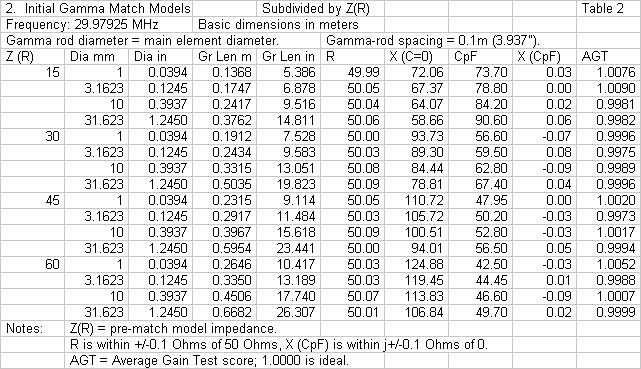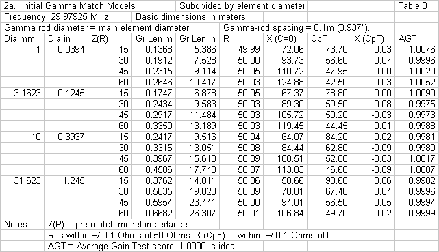 One important reason for freezing some of the model dimensions is to permit a survey of others. The initial models in this new study used a range of element and gamma-rod diameters ranging from 1 mm to 31.623 mm. Although the range may seem strange at first sight, the steps (1, 3.1623, 10, and 31.623) are equivalent to base-10 logarithms of -4 through -2.5 as a function of wavelength. The range of the coverage is from close to 0.04" (AWG #18 wire) up to nearly 1.25". Hence, the range of element diameters does not extend on either end very far beyond the range of materials from which we find gamma-match applications in the test frequency region (10 meters). The second axis of the survey involved a span of initial resonant element impedances. Although gamma matches may cover a wider range, 15 through 60 Ohms seemed to be a good range for conversion to a target feedline impedance of 50 Ohms. Indeed, it was possible to create initial 2-element Yagis with the desired feedpoint impedances, as shown in Table 1. As in previous models, the initial beams, when gamma-matched, produced a 50-Ohm driver impedance +/- 0.1 Ohms for both resistance and reactance.