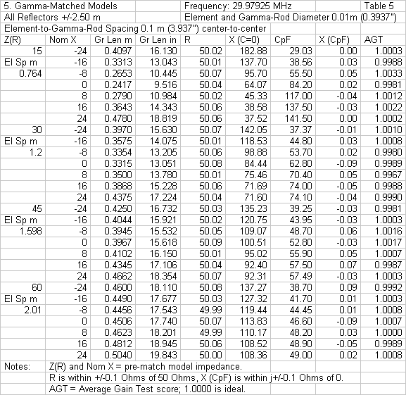 For each of the 28 initial models, there is an accompanying gamma-match model. Each of these models uses a gamma rod length and series capacitance that brings the gamma feedpoint impedance to 50 Ohms resistive within the usual limits imposed on the exercise. Table 5 provides a record of the data in progressive form. The gamma rod length was varied until the resistive component was 50 Ohms and the reactance was recorded. Although one might simply use this information to calculate the required series capacitance, I modeled it in place and recorded both the capacitance value and the remnant reactance. The AGT scores are also part of the tabular record.