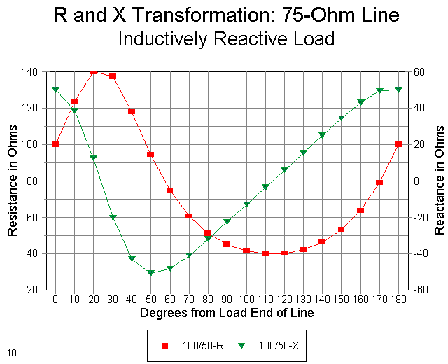 Notice also that the peak resistance values for the inductive loads are higher than 50 ohms. This is a function of the fact that the reflection coefficient and SWR are higher with these loads than with the 25-ohm load. From this graph, however, we cannot determine either what the SWR is or precisely what the best line length will be. These decisions require that we know what happens to the reactance along the line.