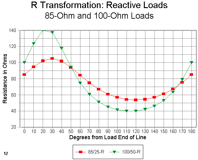 For the comparison, Figure 12 shows just the resistance curves for the 85 + j25 ohm and the 100 + j50 ohm loads. Notice that even the resistive part of the impedance does not form a sine wave curve for either case. Rather, peaks occur over a smaller portion of the total line length, while nulls are spread out over a longer portion of the total line length. The higher the reactance, the higher the peak and the smaller portion of the line to which it is confined.