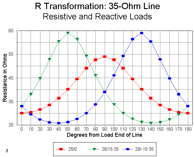 The final tool that you need is a slight change of approach: free yourself from the idea that the matching section will be always be 1/4 wavelength long. Figure 2 shows why. It graphs the resistive part of the impedance along a 35-ohm transmission line for a half wavelength (180 electrical degrees). The three loads are as follows: exactly 25- ohms resistive, a complex load of 28 + j15 ohms (inductively reactive), and a complex load of 28 - j15 ohms (capacitively reactive).