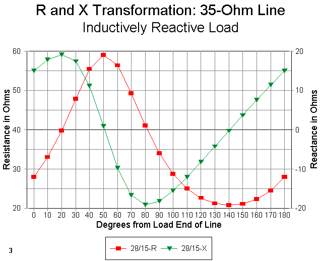 Figure 3 shows both the resistance and reactance (using separate Y-axis scales) for the 28 + j15 ohm (inductively reactive) load. The reactance curve is interesting since it clearly shows that the reactance does not vary in a nice sinusoidal curve. Rather, it ramps, meaning that it changes value slowly for one direction in the curve and more rapidly in the other direction. This fact means that if you must choose a line length where the curve is changing more rapidly, the working bandwidth may shrink for your matching section. Likewise, the higher the reactance--and hence, the higher the SWR--the more rapid the change and the narrower the operating bandwidth for the matching section.