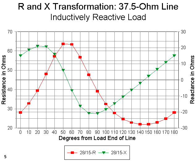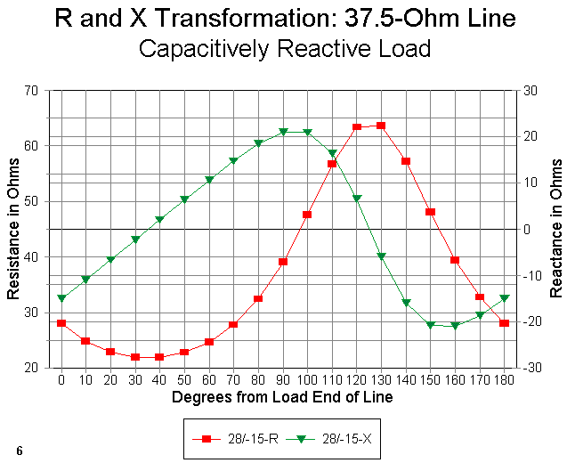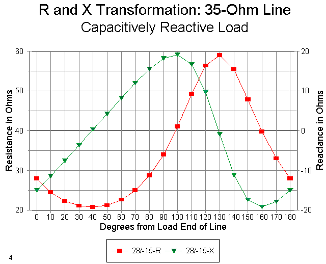 Figure 4 shows the resistance and reactance curves for the 28 - j15 ohm (capacitively reactive) load. Since we are interested in a resistive value close to 50 ohms and a reactance close to zero, we will select a length of about 130 degrees.